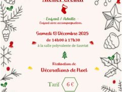 Retrouvez l’association Artistic Friends pour son prochain atelier de loisir créatif. Le samedi 13 décembre de 14h à 17h30 A la salle polyvalente de Sauviat 👇️