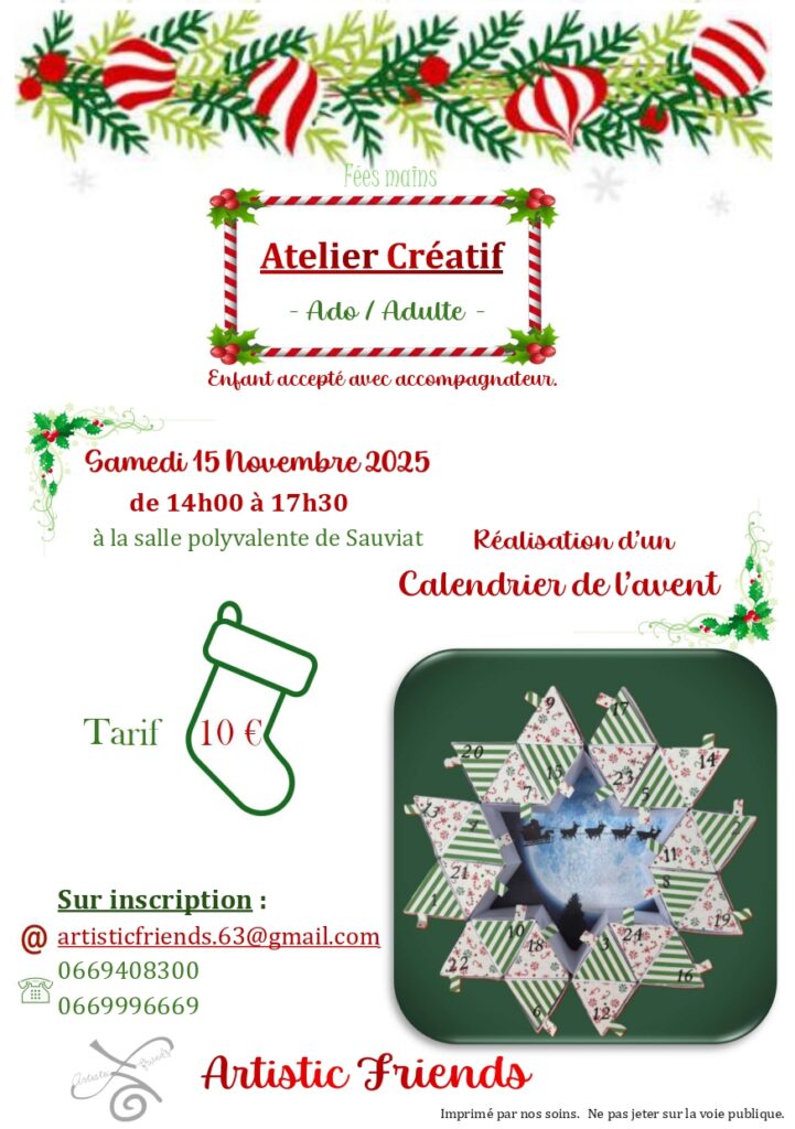 Prochaine séance le samedi 15 novembre 2025 de 14h à 17h30 à la salle polyvalente de Sauviat. Venez réaliser votre calendrier de l’Avent.