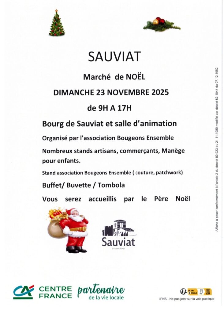 🎅 L’association Bougeons Ensemble vous propose un marché de Noël le dimanche 23 novembre 2025 de 9h à 17h au bourg de Sauviat et à la salle polyvalente. 🎄❄