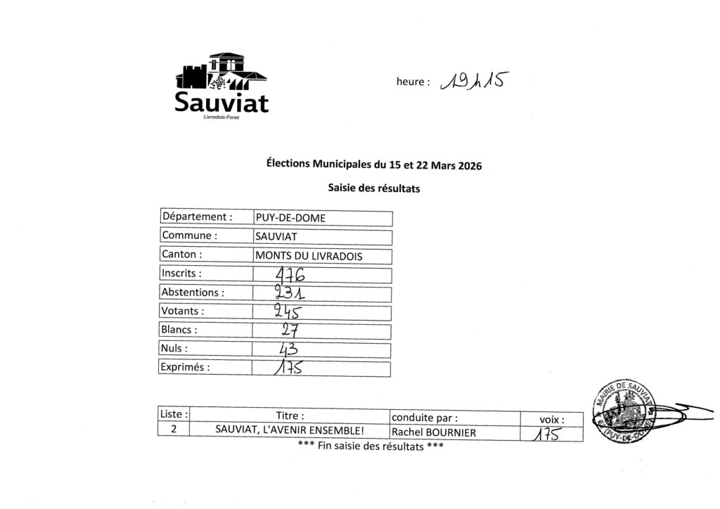 Voici les résultats des élections municipales du 15 mars 2026 à Sauviat